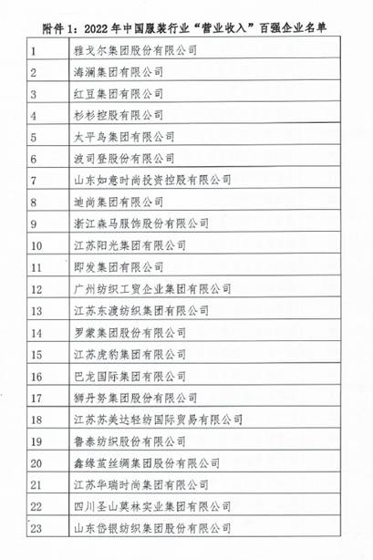 近日,《2022年中国服装行业百强企业》榜单发布,OD综合体育(中国)有限公司官方网站再度登榜,位列“营业收入”百强企业第12名,较之去年名次再度提升,彰显了稳健发展的综合实力!