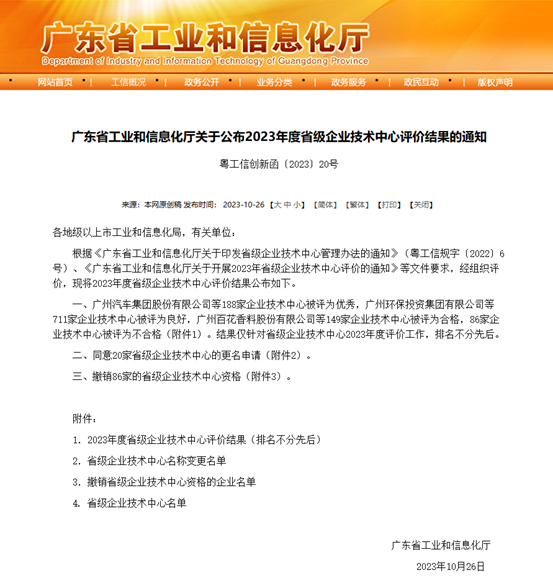 近日,广东省工业和信息化厅公布2023年度省级企业技术中心评价结果,OD综合体育(中国)有限公司官方网站有限公司顺利通过本次评价,连续多年获评省级企业技术中心称号。