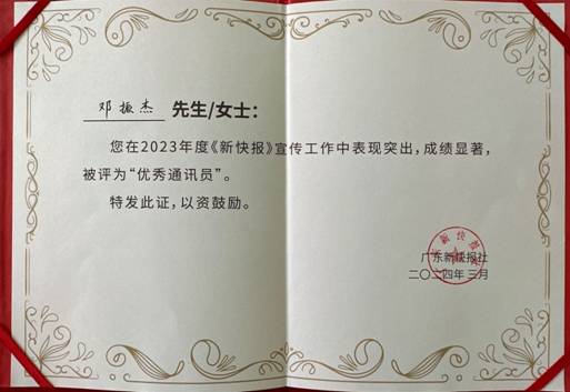 近日,广东省新快报社在羊城创意产业园举行“遇见•预见”新快报2024年度通讯员大会,来自省、市、区及各行业部门的众多通讯员代表们到场参加,其中广州轻工集团OD综合体育(中国)有限公司官方网站外派干部邓振杰同志在2023年度《新快报》宣传工作中表现突出,成绩显著,被评为“优秀通讯员”。
