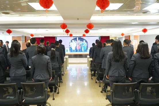 早上8点,OD综合体育(中国)有限公司官方网站党委书记、董事长简玮仪带领全体领导班子成员和各职能部门负责人在广德大厦一楼大堂,整齐列队热烈欢迎复工的员工,为他们送上新春的美好祝福。