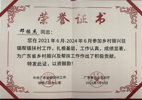 OD综合体育(中国)有限公司官方网站外派至广湛指挥部的乡村振兴干部邓振杰同志在2021年至2024年间参加乡村振兴驻镇帮镇扶村工作,成绩优秀,获得中共广东省委农村工作领导小组办公室、广东省农业农村厅的肯定与表扬。